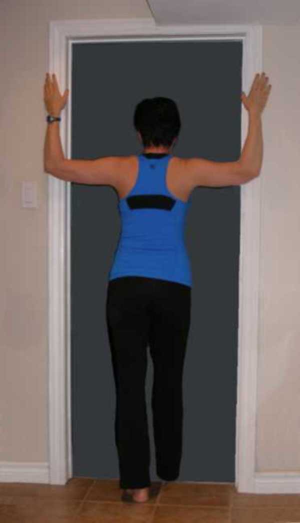 Đứng trong một ô cửa, giữ cánh tay của bạn lên quá khuỷu tay ở góc 90 độ và cánh tay của bạn tạo thành một góc 90 độ để cơ thể của bạn ở vai. Đặt mỗi tay áp vào một bên của khung cửa, đặt một chân về phía trước khi bạn đứng thẳng, Giữ cổ thẳng với cột sống. Nghiêng về phía trước giống như áp mình vào khung cửa. Giữ căng trong 20-30 giây. Lặp lại 2-3 lần.