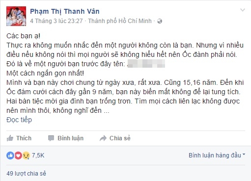 Trong một bài viết rất dài đăng tải trên Facebook, Ốc Thanh Vân đã kể rõ ngọn ngành về việc bị một người bạn rất thân lợi dụng để lừa tiền người khác.