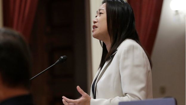 Thượng nghị sỹ Janet Nguyễn phát biểu trước khi bị đưa ra khỏi cuộc họp ở Sacramento hôm 23/2