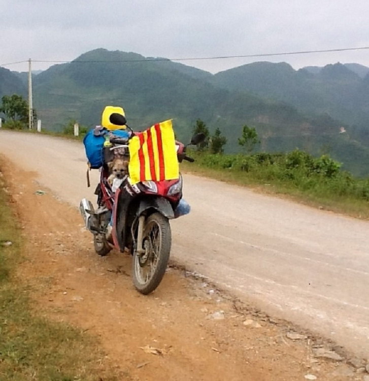 Một xe máy tại Việt Nam mang cờ vàng ba sọc đỏ.