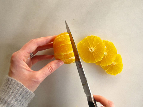 - Cắt cam thành từng khoanh dày khoảng 5mm.
