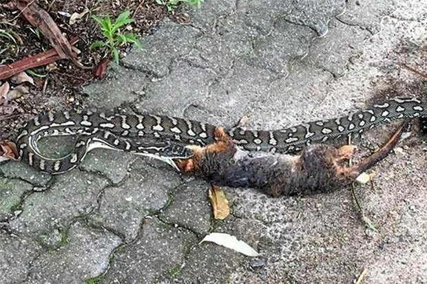 Con trăn siết chết và nuốt chửng mẹ con thú có túi ngay trên đường ở Úc.