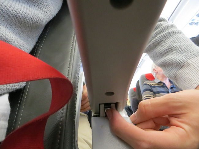 Tùy thuộc vào từng loại máy bay khác nhau mà dưới thanh dựa tay ghế sẽ tồn tại 1 nút bấm hoặc cần gạt nhỏ.