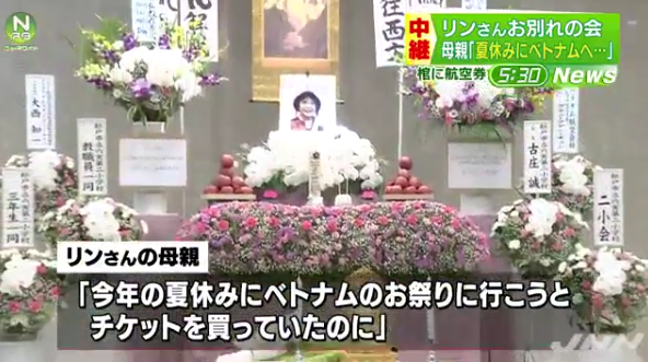 Nhiều người Việt rất quan tâm và xót thương trước cái chết của bé gái người Việt 10 tuổi bị bắt cóc và giết hại tại Nhật Bản.Vào ngày lễ cầu siêu cho bé,rất đông người Việt tại Nhật Bản đã đến dự buổi lễ.Ngày cầu siêu cho bé thời tiết mưa và rất lạnh.