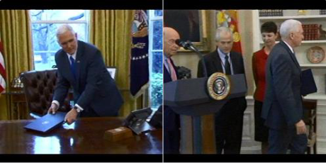 Phó Tổng thống Mike Pence dường như phát hiện ra vấn đề nên đã quay lại lấy xấp văn kiện rồi rời khỏi phòng. Ông Trump sau đó đã ký ban hành sắc lệnh trong một căn phòng khác.