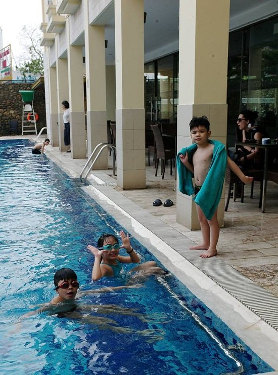 Hình ảnh ba con Bờm, Bách, Bông của đạo diễn Trần Lực thích thú đi bơi cùng bố mẹ trong ngày nghỉ vui vẻ bên gia đình.