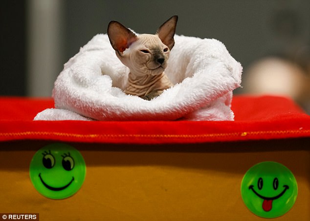 Dù có ngoại hình kì dị nhưng mèo không lông nhận được sự chú ý và quan tâm đặc biệt của người tham gia triển lãm. Nhiều người không ngần ngại ôm ấp hay hôn chú mèo không lông.