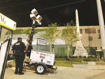 Cảnh sát đang canh gác trước khi tượng đài tưởng niệm Trận Đánh Liberty Place được tháo gỡ vào sáng thứ Hai. (WWWLTV)