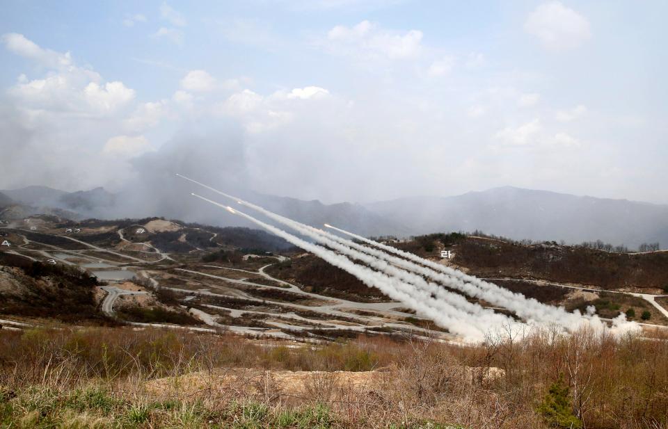 Hệ thống phóng tên lửa đa nòng của Mỹ và Hàn Quốc (MLRS) thực hiện bài tập quân sự nhằm đẩy lùi một cuộc tấn công của Triều Tiên