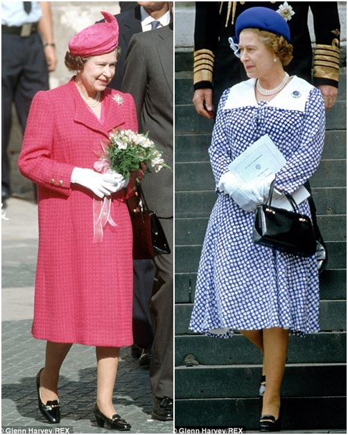 Mẫu giày theo chân Nữ hoàng trong những năm 1984 (ảnh trái) và song hành cùng Nữ hoàng tại đất nước Tây Ban Nha năm 1987 . Đôi giày cũng đã trải qua giai đoạn trị vì của triều vua Juan Carlos