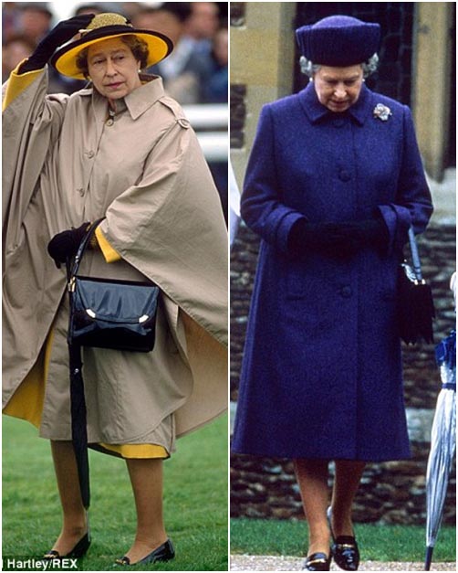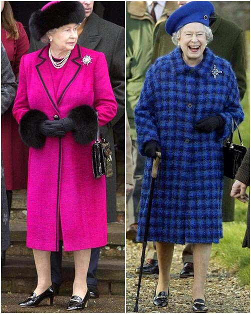 Nữ hoàng lựa chọn đôi slip-on huyền thoại để đi xem trận bóng Derby năm 1990 (ảnh trái) và tự tin "thả dáng" tại cung điện Sandringham (ảnh phải) vào Giáng sinh năm 1993.