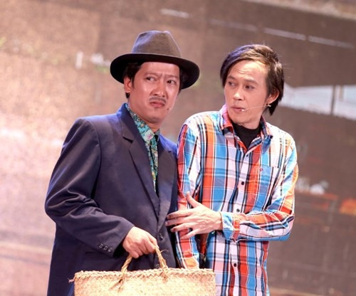 Nam diễn viên hài Trường Giang và Hoài Linh trong một lần biểu diễn chung