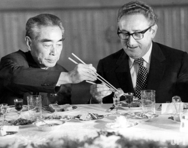 Chu Ân Lai, khi đó là thủ tướng Trung Quốc, cùng Henry Kissinger, lúc ấy giữ chức ngoại trưởng Mỹ trong một tiệc chiêu đãi tại Đại lễ đường Nhân dân Bắc Kinh vào ngày 10/11/1973. Ảnh: UPI.