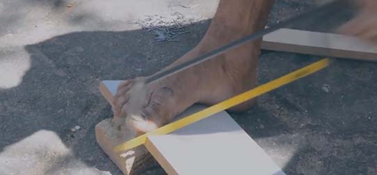 Và dùng chân cưa gỗ một cách thành thục.
