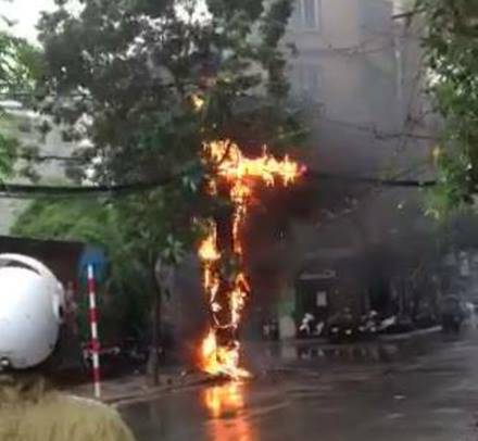 Old  Lightbulb Hà Nội: đang mưa rất to cột điện bất ngờ bốc cháy.