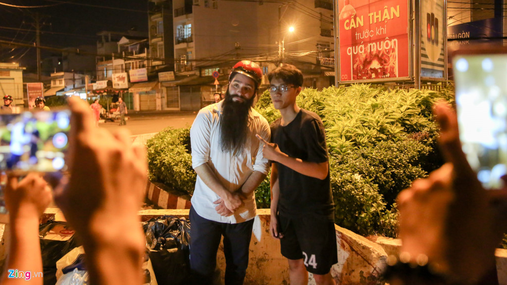 Khuya 13/5, đạo diễn Kong: Skull Island Jordan Vogt-Roberts đi dọc nhiều tuyến đường từ quận 1 sang quận 6 để gửi cơm từ thiện cho những người vô gia cư. Đạo diễn người Mỹ di chuyển bằng xe máy, do người đẹp Emily Hồng Nhung cầm lái.