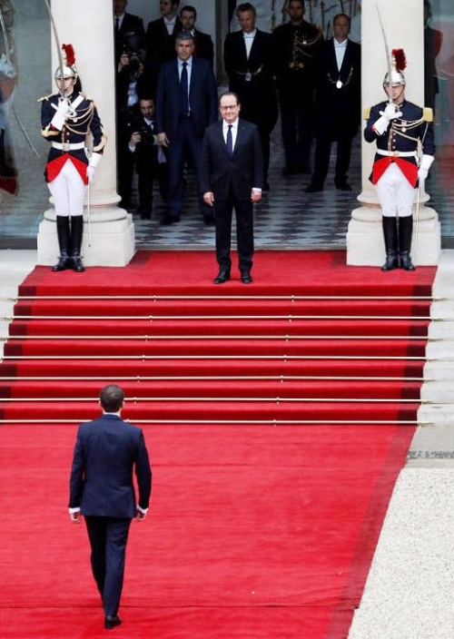 Người tiền nhiệm François Hollande đứng trước cửa Điện Élysée chờ ông Macron. Ông Macron mặc bộ vest tối màu của thương hiệu Pháp Jonas & Cie trị giá 450 Euro.