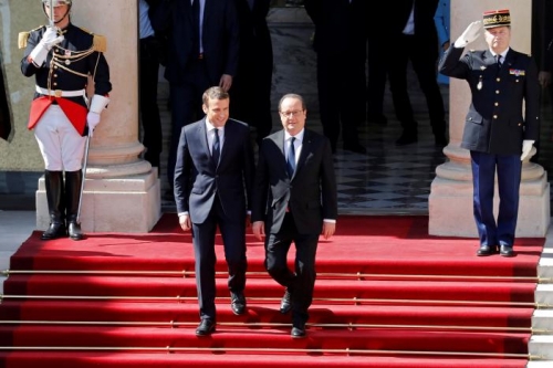Sau các thủ tục chuyển giao quyền lực hoàn tất, ông Macron tiễn người tiền nhiệm Hollande ra xe rời khỏi Điện Élysée.