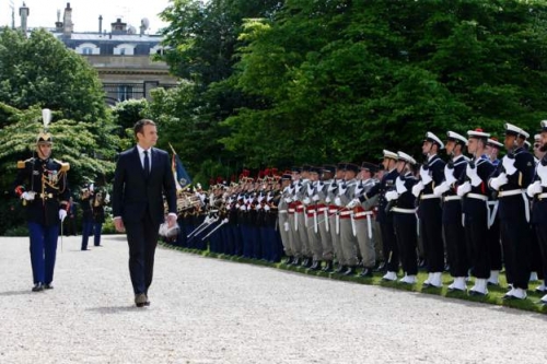 Sau đó, tân Tổng thống Pháp tham dự một nghi lễ với sự tham gia của hàng trăm quan chức và khách mời. Hình ảnh Tổng thống Macron tham gia duyệt đội binh danh dự.