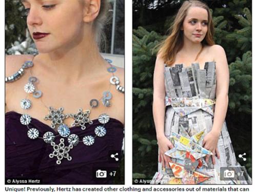 Đây không phải là thiết kế độc đáo đầu tiên của Alyssa. Trước đó, cô gái đã tạo ra những trang phục từ những chất liệu ít người nghĩ tới như bộ quần áo làm từ giấy báo, vòng đeo cổ làm từ ốc vít.