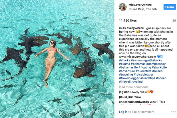 Mareen quyết định chụp ảnh cùng một đàn cá mập trong vùng biển trong suốt của Compass Cay - hòn đảo nhân tạo ở Bahamas. Hình ảnh tuyệt đẹp cho thấy ngôi sao Instagram mặc bộ bikini màu nâu nhạt, được bao quanh bởi những kẻ săn mồi.