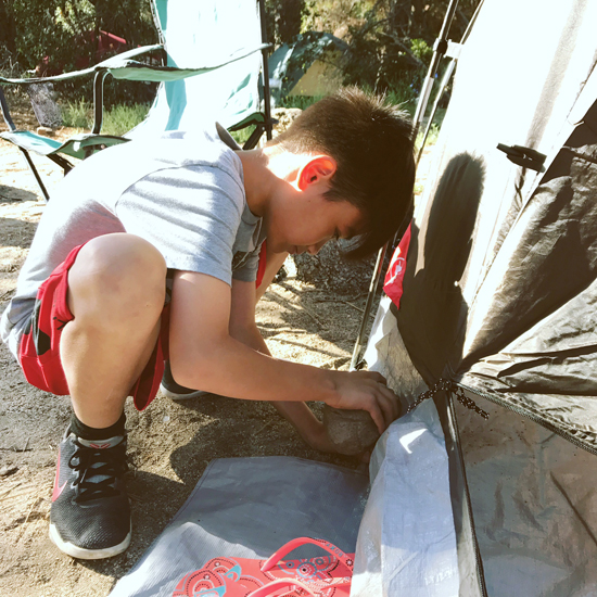 Kim Hiền và ông xã tất bật dựng lều để ngủ qua đêm.