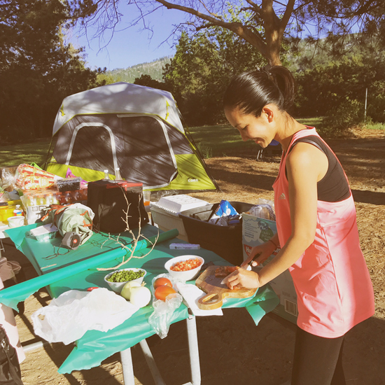 Sau khi công việc dựng lều hoàn tất, Kim Hiền bận rộn nấu bữa ăn tối cho cả nhà.