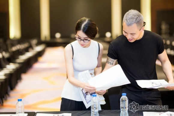 Hình ảnh cô cùng ông bầu Khắc Tiệp tất bật đêm chung kết "New Face, New Style" mới đây