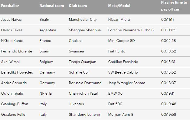 Trang Carspring mới đây đã làm một thống kê cho thấy độ giàu có của các cầu thủ lớn đến thế nào. Những chiếc xe họ đi hàng ngày chỉ cần làm trong ít giờ, thậm chí là trong chục phút đã đủ tiền mua xe.