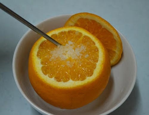 – Cắt phần nắp của quả cam/quýt như hình dưới, cho 1/2 hoặc 1 thìa cà phê muối vào miệng quả. Bạn có thể dùng nỉa hoặc tăm xăm để muối thấm vào trong quả cam/quýt.