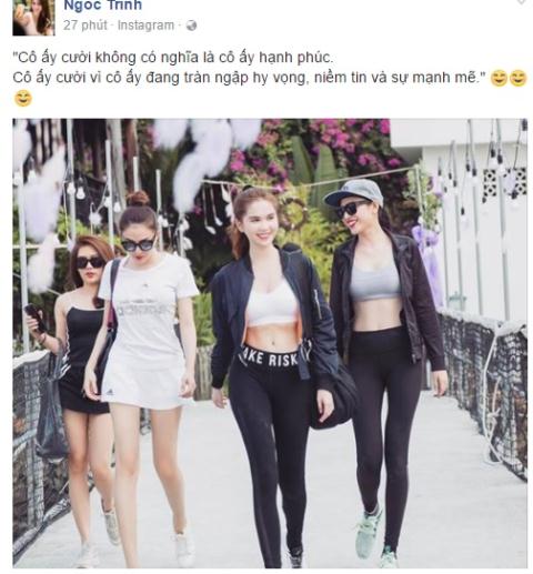 Tuy nhiên, người đẹp 28 tuổi vẫn có những dòng trạng thái chung chung, mơ hồ nhưng nhiều người dễ dàng đoán được cô nàng đang muốn ám chi đến chuyện tình đầy tai tiếng của mình. "Cô ấy cười không có nghĩa là cô ấy hạnh phúc. Cô ấy cười vì cô ấy đang tràn ngập hy vọng, niềm tin và sự mạnh mẽ" - Ngọc Trinh từng viết.