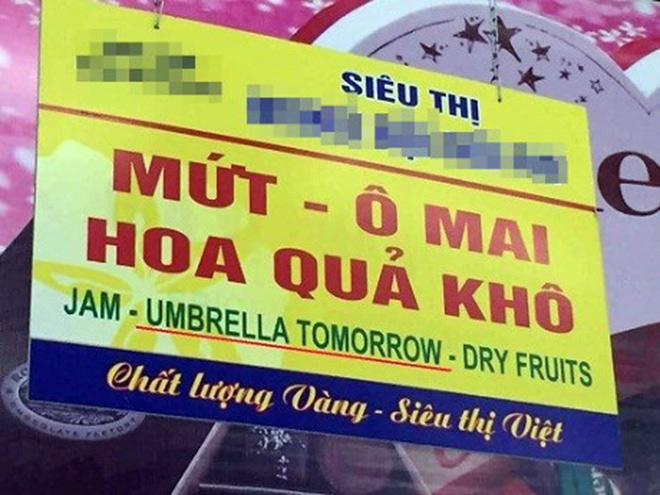 Biển hiệu của một cửa hàng ăn uống với các món ăn được ghi bằng cả tiếng Việt lẫn tiếng Anh thế nhưng khi nhìn kỹ người xem mới ngã ngửa bởi tất cả đều được dịch sai và hoàn toàn khác xa nghĩa gốc của nó.