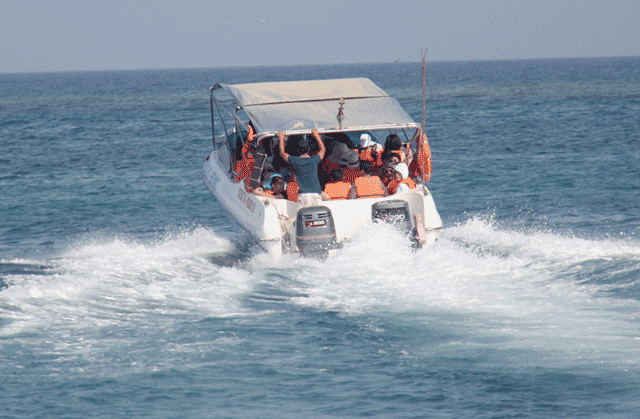 Ca nô đang đưa du khách bị kẹt ở đảo Bé trở lại đảo Lớn.