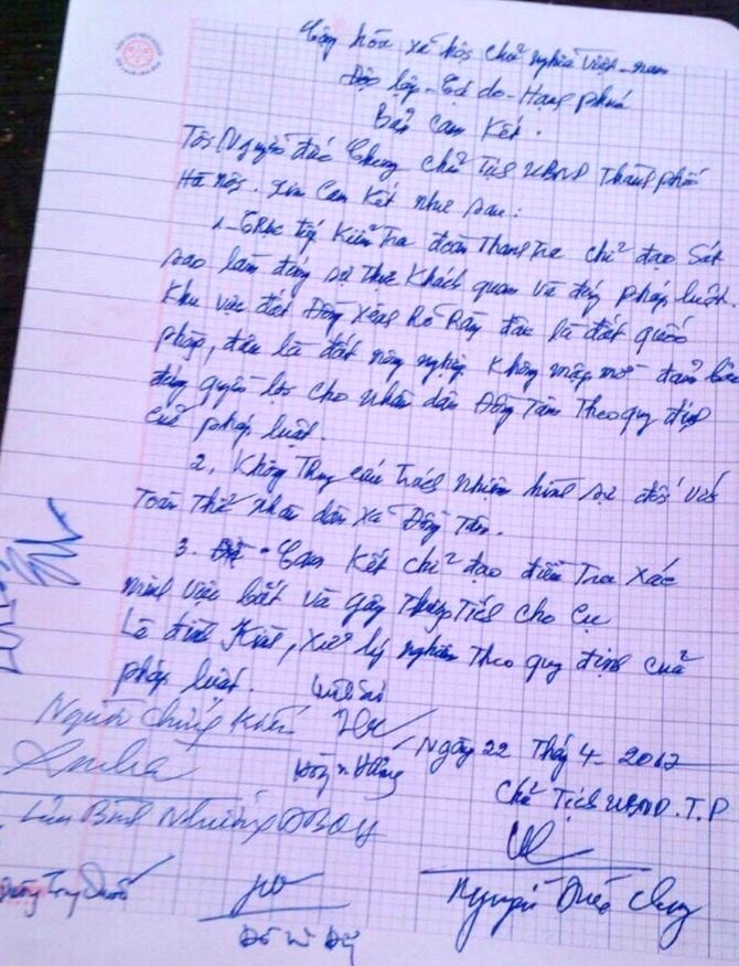Bản cam kết của ông Nguyễn Ðức Chung trong đó có điều “không khởi tố người dân Ðồng Tâm.”