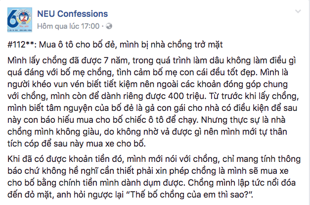 "Mình lấy chồng đã được 7 năm, trong quá trình làm dâu không làm điều gì quá đáng với bố mẹ chồng, tình cảm bố mẹ con cái đều tốt đẹp. Mình là người khéo vun vén biết tiết kiệm nên ngoài các khoản đóng góp chung với chồng, mình còn để dành riêng được 400 triệu. Từ trước khi lấy chồng, mình biết tâm nguyện của bố đẻ là gả con gái cho nhà có điều kiện để sau này con báo hiếu mua cho bố chiếc ô tô để chạy. Nhưng thực sự là nhà chồng mình không giàu, do không nhờ vả được gì nên mình mới tự thân tích cóp để sau này mua xe cho bố.