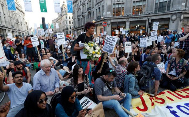 Vietbf.com - Hơn 1.000 người tập trung trước dinh thủ tướng Anh để biểu tình phản đối sự lãnh đạo của bà Theresa May sau vụ cháy chung cư làm hàng chục người chết, trước sự giận dữ của nhiều người biểu tình hô vang khẩu hiệu: "Chúng tôi muốn công lý".