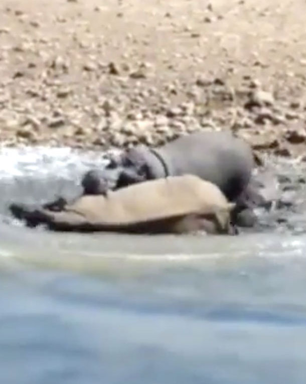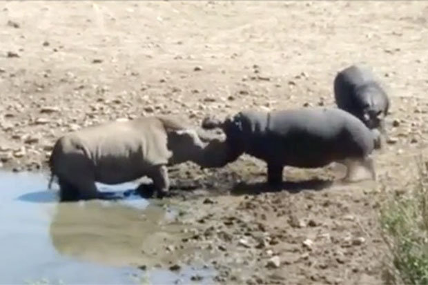 Cuộc chiến giữa hà mã nóng tính và tê giác ở tự nhiên rất ít khi xảy ra. Nhưng con hà mã này đã lao vào cắn chết cả tê giác. Có vẻ như con tê giác lúc đầu không hề biết sự có mặt của hà mã.