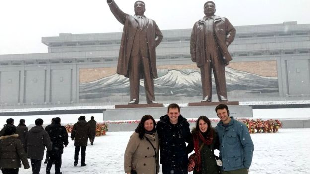 Sinh viên Mỹ Otto Warmbier (ngoài cùng bên phải) khi tới thăm Triều Tiên (Ảnh: BBC)
