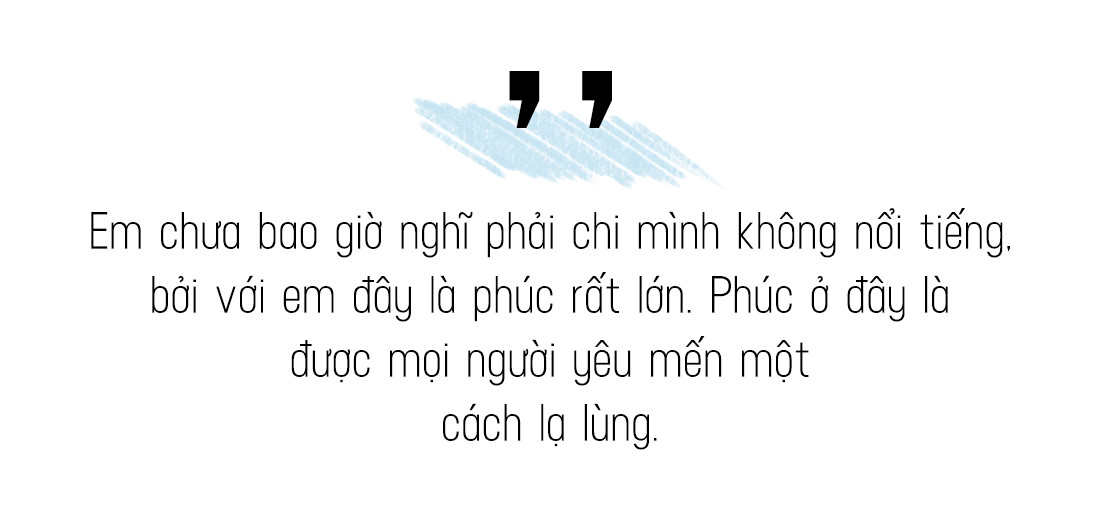 Phúc ở đây là được mọi người yêu mến một cách lạ lùng. Mọi người không hề quen biết nhưng yêu giọng hát của em nên quư luôn con người em, cho đồ ăn, quà tặng. Nhiều khi em tự hỏi v́ sao mọi người lại tốt với ḿnh đến như vậy.