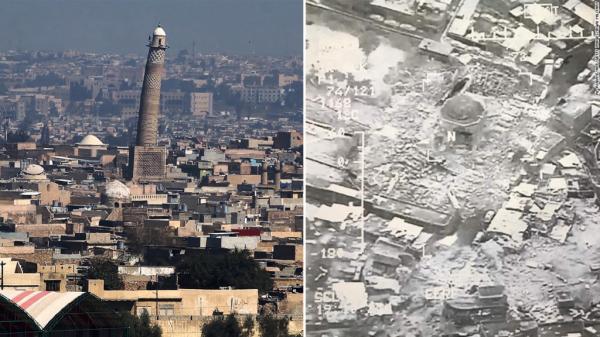 Thánh đường Al Nuri, Mosul, Iraq: Thánh đường có tuổi đời 850 năm là một trong các di sản văn hóa mới nhất bị hủy hoại bởi chiến tranh khi IS phá hủy công trình này hôm 21/6 vừa qua. Ảnh: AFP.
