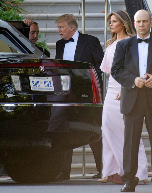 Tới dự đám cưới, Tổng thống Trump mặc một bộ đồ tuxedo màu đen cổ điển, trong khi đó, Đệ nhất Phu nhân Melania Trump diện váy dài màu hồng phấn.