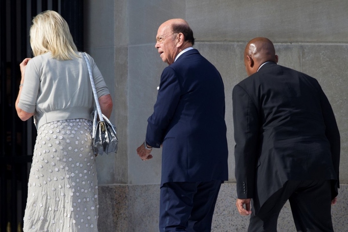 Bộ trưởng Thương mại (giữa) đã buột miệng tiết lộ về đám cưới của Bộ trưởng Tài chính Steven Mnuchin trước đó khoảng một tuần khi giới thiệu ông Mnuchin lên phát biểu trong một hội nghị.