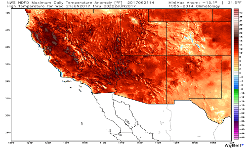 Dự báo nhiệt độ trung bình khu vực tây nam nước Mỹ hôm 21.4.2017. Ảnh: Weatherbell Analytics.