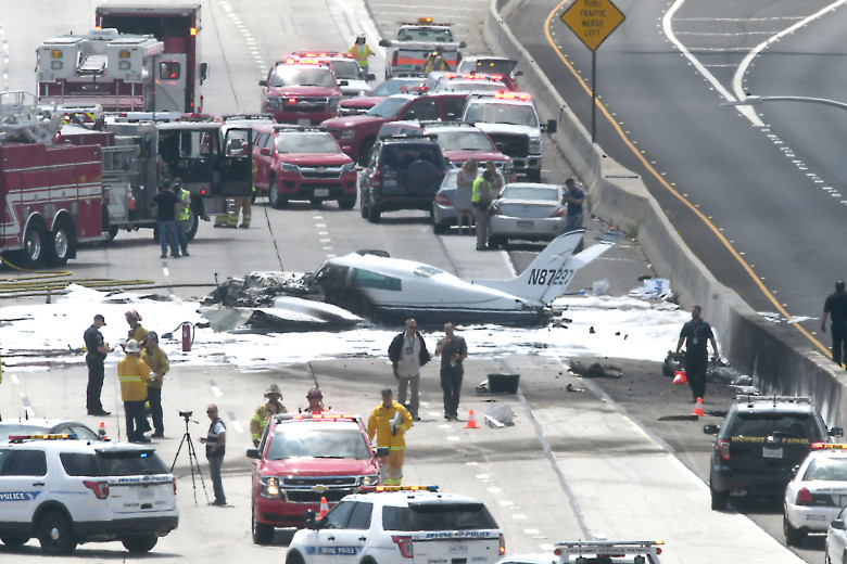 Lúc 9:35 giờ sáng, chiếc phi cơ Cessna rơi trúng một xe hơi trên đường, mảnh vụn tung vào 3 xe hơi khác.