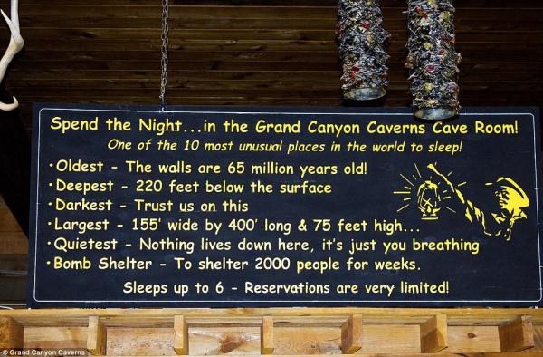 Nằm trong hang động khô lớn nhất nước Mỹ, khách sạn vô cùng tối tăm và yên tĩnh. Nước được các nhân viên mang xuống phòng bằng thang máy. Khách sạn rộng hơn 60 m, dài khoảng 122 m và trần cao hơn 21 m, đủ chỗ cho 6 người, có 2 giường đôi và một sofa.