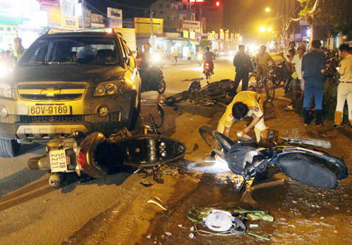 Một vụ tai nạn mới đây xảy ra ở Quận 9,Thành phố Hồ Chí Minh.Người lái xe là một công an đã tông hàng loạt xe máy.Vụ việc khiến nhiều người bị thương.