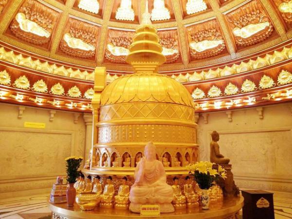 Ngay tại tầng 1 của Bảo Tháp, một bức tượng phật lớn dát vàng, ngồi uy nghi trên đài được trạm khắc tinh xảo. Mới bước chân vào khu vực này, du khách như lạc vào cõi tiên với sự nguy nga, lộng lẫy của Bảo Tháp với nhiều họa tiết hoa văn hiếm có ở Việt Nam.