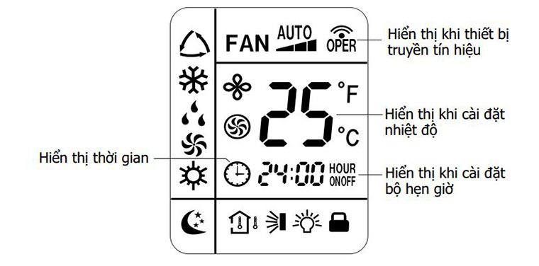 Biểu tượng mặt trăng khuyết: Xuất hiện là khi ấn nút ECONO trên điều khiển. Tức chức năng hoạt động tiết kiệm điện được kích hoạt. Và để tắt chức năng này chỉ cần ấn lại nút ECONO lại lần nữa. Làm vậy biểu tượng mặt trăng khuyết cũng sẽ tự động biến mất khỏi màn hình điều khiển.