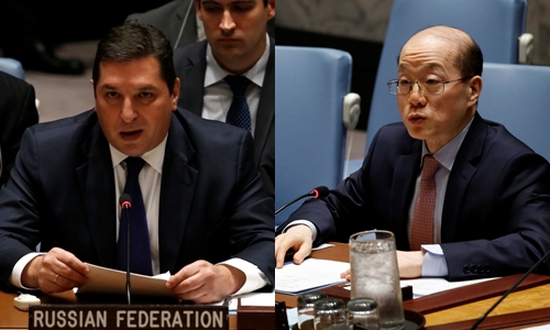 Đại sứ Nga tại Liên Hợp Quốc Vladimir Safronkov (trái) và người đồng cấp Trung Quốc Liu Jieyi