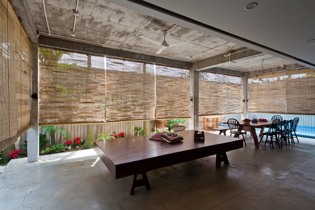Toàn bộ không gian dưới “gầm” nhà với 3 mặt mở thoáng đãng được sử dụng làm phòng bếp và phòng ăn.